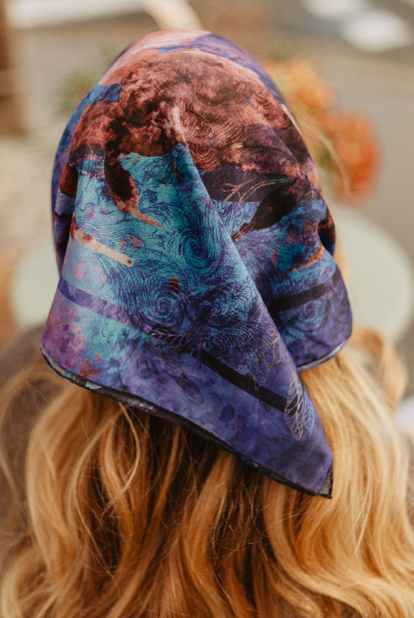 Chaque foulard de la capsule Belle étoile est imprimé en très petite quantité de 4 pièces par dessin, dans une démarche artisanale et respectueuse de l’environnement.